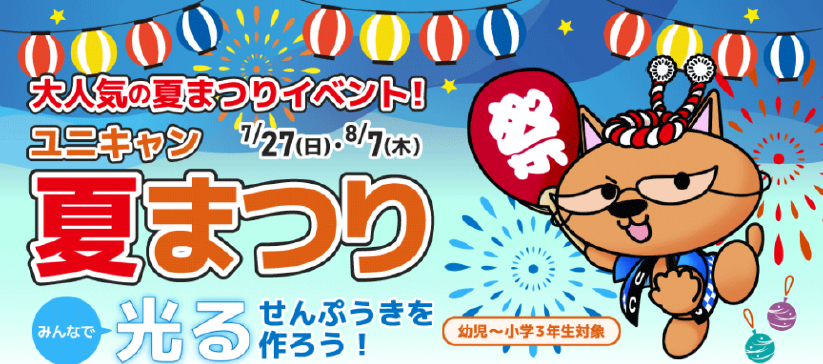 本イベントでは、外国人の先生と一緒に工作でよく使う英語を交えて、ひとりひとりの「オリジナル光る扇風機」を作ります。また、英語のミニレッスンの体験や、オリジナル「ユニキャン特製シール」のプレゼントを実施します。子どもの英会話教室に関心がある、夏休み期間中に英語に触れる機会を持たせたいとお考えのご家庭には、楽しく気軽に英語に触れられるイベントです。ぜひ、ご利用ください。