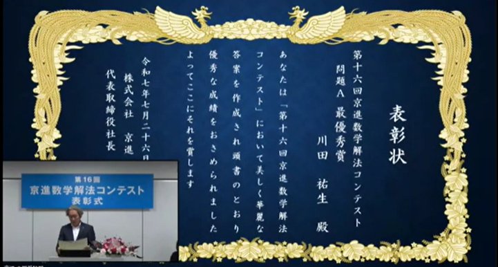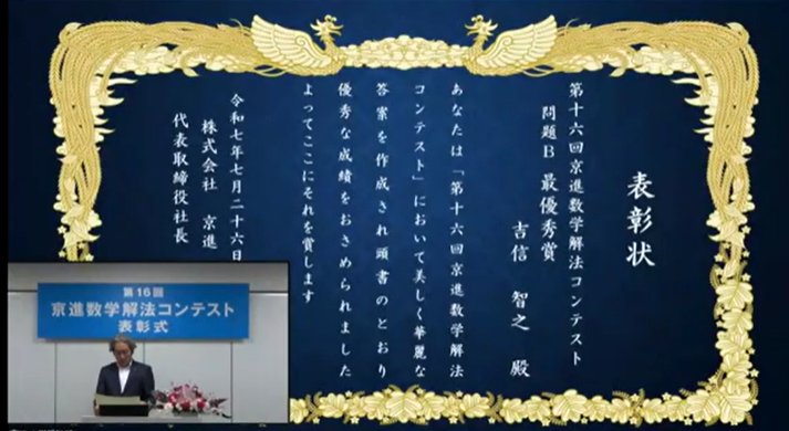 京都・滋賀・愛知を中心に学習塾を展開する京進が主催する、「第16回 京進 数学解法コンテスト」では、厳正なる審査の結果、入賞者18名を決定しました。2025年7月26日(土)に表彰式がオンラインで行われ、受賞者への表彰や各問題の講評の他、本コンテストの過去入賞者である現役大学生・大学院生への質疑応答の場も設け、参加者同士の交流を深めました。