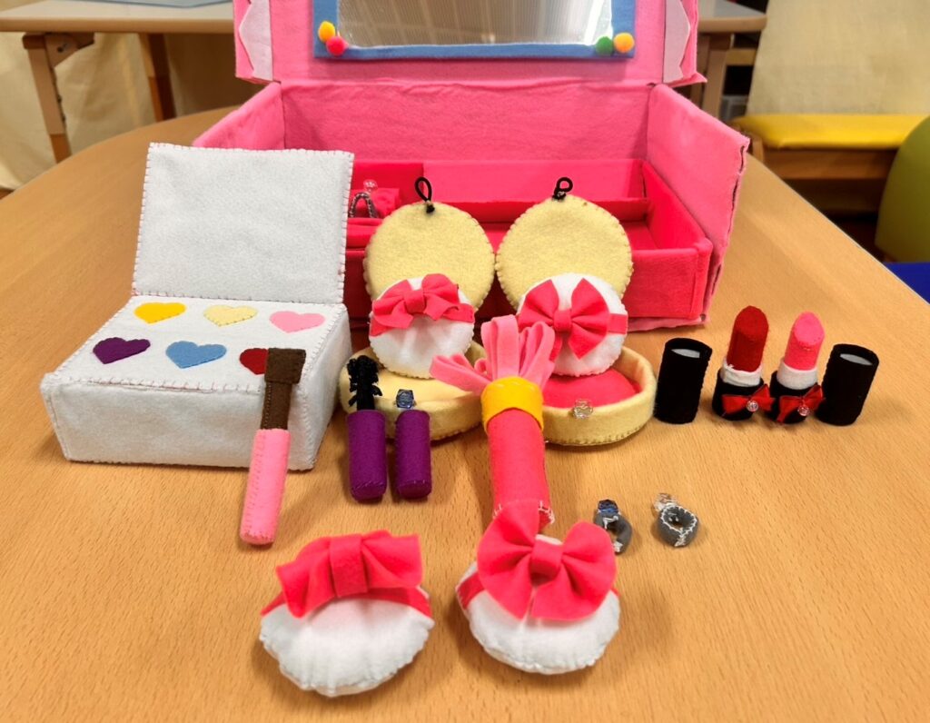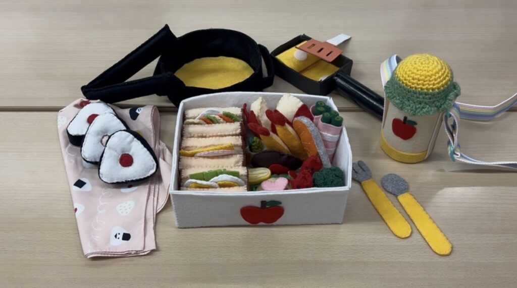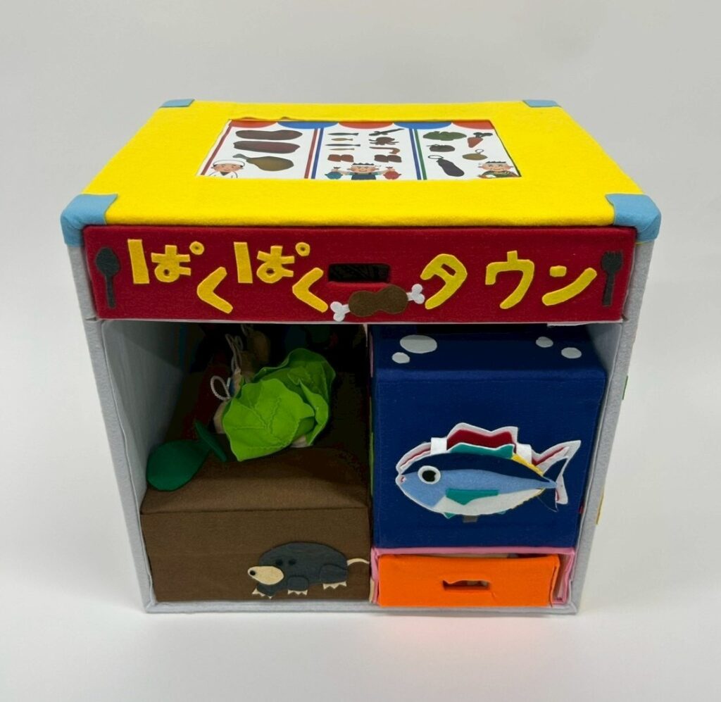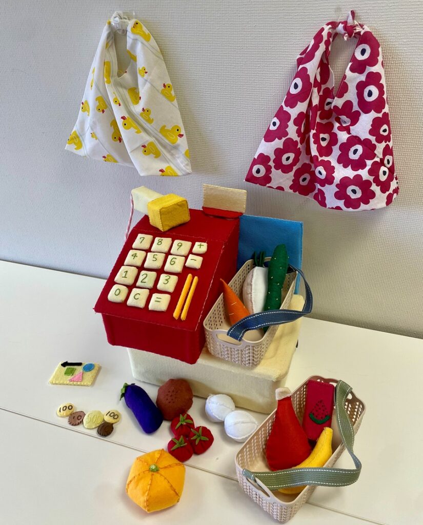 <評価ポイント> 縫製が丁寧に施されており、手縫いのエコバッグやレジのボタンの触感、ICカードまで細やかに再現された完成度の高さが際立つ。道具ひとつひとつがリアルで、ボタンを外してコンパクトに収納できる工夫は片付けの流れをスムーズにする配慮が光る。箱を開けた瞬間から「いらっしゃいませ」が始まり、子どもたちが没頭して遊び込める作品に仕上がっている。
