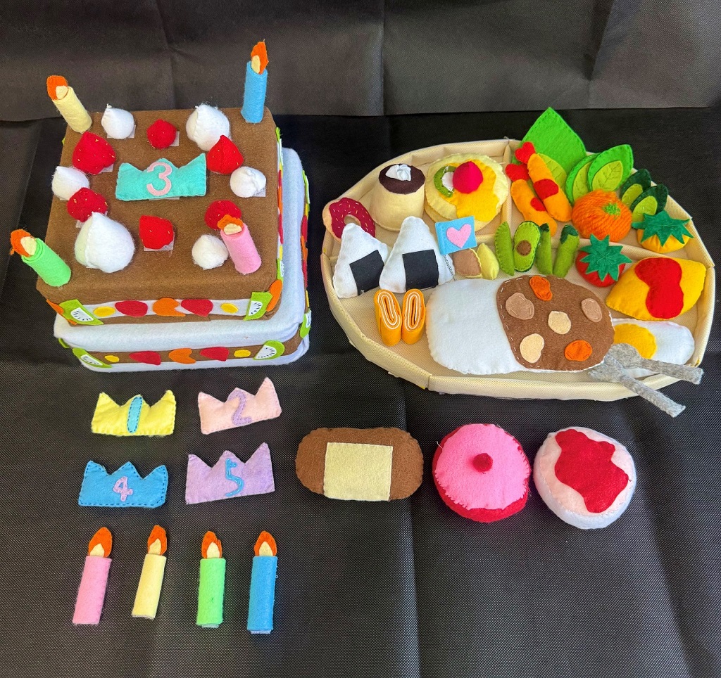 <評価ポイント> カラフルでひとつひとつ丁寧に作られている点が魅力的。マジックテープを使った自由な付け替えの工夫は、遊びの幅を広げる素晴らしいアイデア。デザインや色合いも優れていて、見ているだけで楽しいパーティーの雰囲気が伝わってくる。特にケーキの飾りつけを楽しめる点が秀逸で、食材の細やかな色使いや細部へのこだわりに感心させられる。
