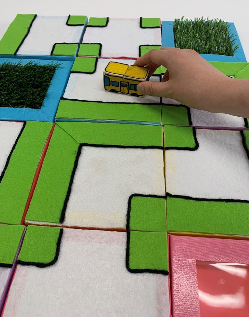 <評価ポイント> コミュニケーションや遊びが広がる魅力的なおもちゃ。園の積み木と組み合わせて街を作るなど、遊びの幅も広がる。安全面への配慮が行き届き、マジックテープの角を丁寧に処理している点が安心感を与える。デザインでは道路と芝の境目に黒い毛糸を使い、全体の印象を引き締めている。さまざまな素材が巧みに使われ、楽しく作られた工夫が伝わる作品。