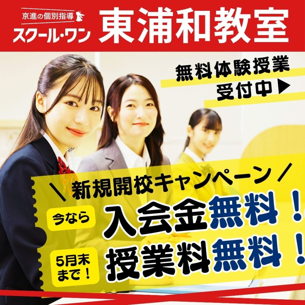 東浦和教室では開校を記念して、2026年3月28日(土)~5月30日(土)までにご入会いただいた方を対象に、入会金無料や授業料無料、QUOカードPayの進呈などのキャンペーンを実施いたします(※概要欄参照)。
