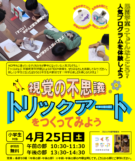 総合教育サービスの株式会社京進(本社:京都市下京区、代表取締役社長:立木康之)が運営する「京進の学童クラブHOPPA」長岡京校(※2026年4月開校)は、地域の子どもたちを対象に、科学への興味を育む体験イベント「視覚の不思議 トリックアートをつくってみよう」を2026年4月25日(土)に開催いたします。